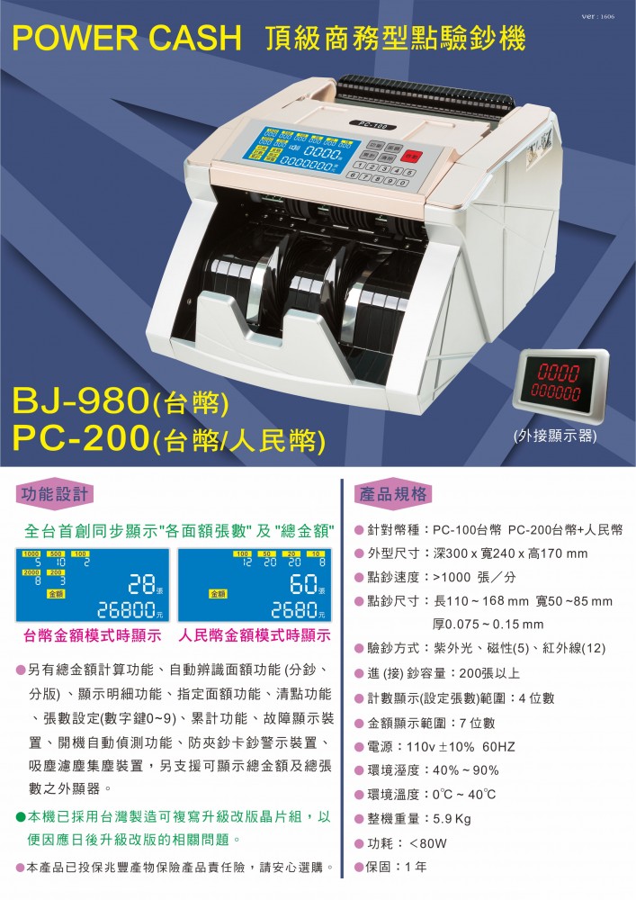 POWER CASH BJ-980(台幣) 頂級商務型點驗鈔機