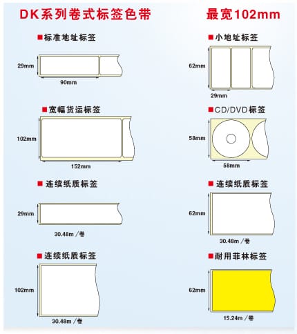 QL-1060N能列印最寬為102mm的寬幅標籤。這類標籤多為大型的貨運資訊標籤、倉儲貨架標識和具有指向性或警示性的標語條幅標籤等。QL-1060N的列印寬度能滿足您對寬幅大型標籤的製作需求。配置300dpi高精度打印頭,能製作更高精度的標籤,具體型號請參考標籤色帶列表。