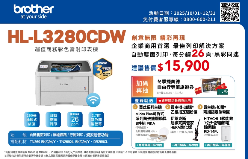 Brother HL-L3280CDW 無線網路雙面彩色雷射印表機