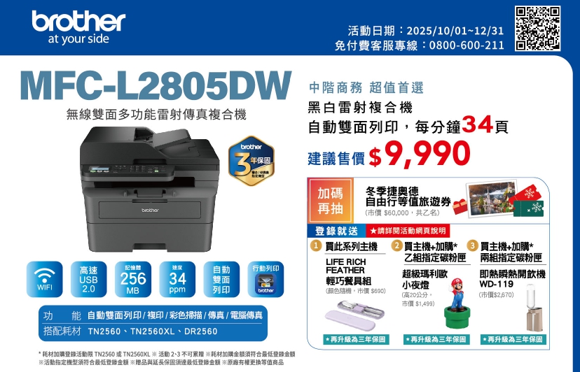 brother MFC-L2805DW 中階商務黑白雷射複合機