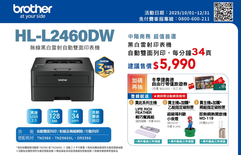 HL-L2460DW 中階商務黑白雷射印表機
